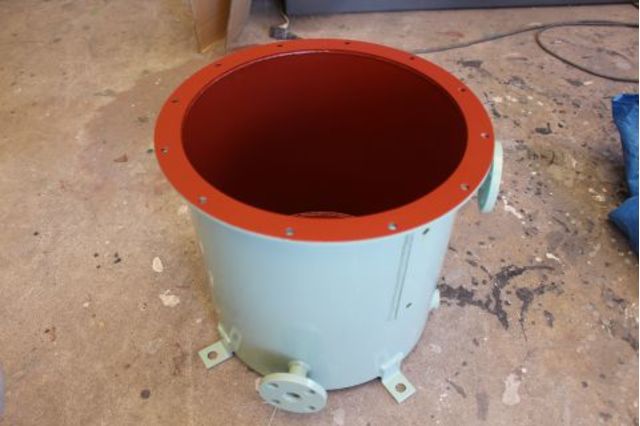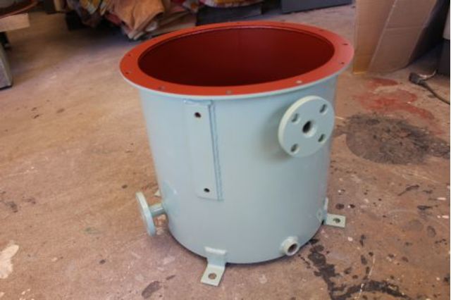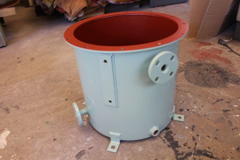外面にメラミン焼付塗装を施した後に内面にラッカー系のプライマーを塗装したタンクです。